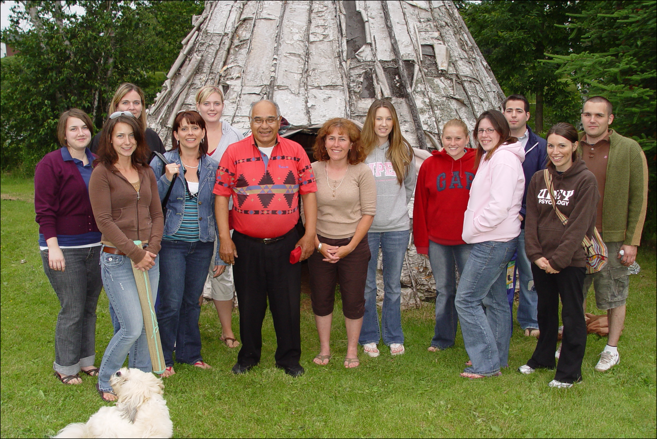 David Varis, IKERAS assistant professor, recalls meeting Dr. Sark. ‘I remember well the first time getting to know Dr. Sark. It was when I took my summer Aboriginal Contemporary Issues and Perspectives class to his home in Johnston’s River to experience a sacred sharing circle. John Joe, as he was known, welcomed us warmly and we just chatted. It was a nice way to begin as any apprehensiveness students may have had melted away instantaneously as John Joe simply put them at ease. We then went onto his well-cared property, which overlooked the river. He talked about the traditions as we walked toward his sweat lodge, and then the birchbark wigwam (Mi’kmaq structure used for shelter and living), where he conducted a sacred sharing circle for the class. For quite a few summers I took students there, and no one was disappointed. We all got to know John Joe well, and that infectious laugh, sharp wit, and the teachings remain as vivid today as they did many years ago.’